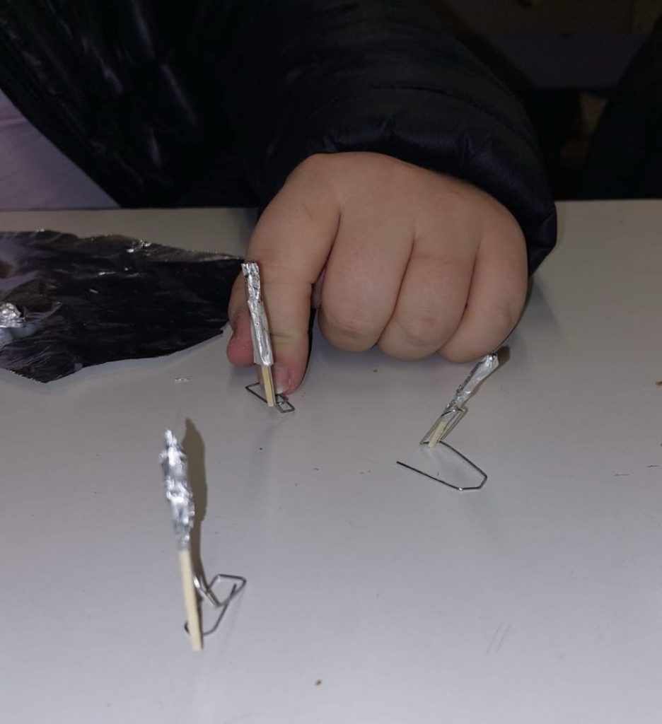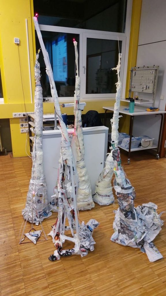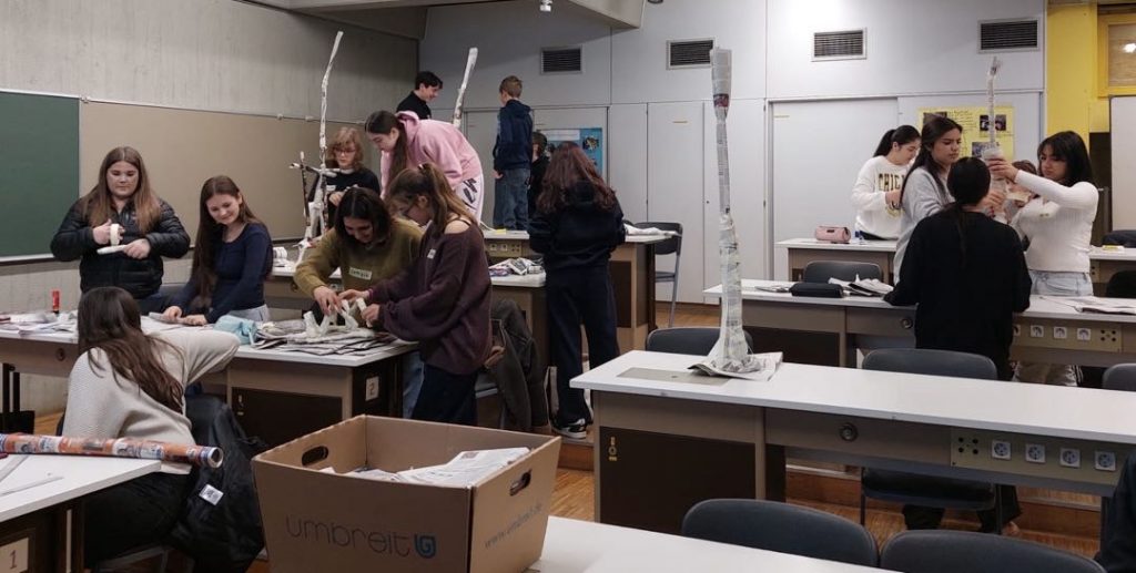Zum Auftakt arbeiteten die Schülerinnen und Schüler in Kleingruppen an der Aufgabe, aus einfachem Zeitungspapier einen möglichst hohen und zugleich stabilen Turm zu bauen. Nach der Konstruktion wurde jeder Turm mit einer LED ausgestattet, die als Warnsignal für den Flugverkehr dienen sollte. Anschließend stellten die Gruppen ihre Modelle vor und testeten deren Stabilität auf einem Erdbebensimulator – ein Moment, der für sichtbare Spannung und einige Überraschungen sorgte.